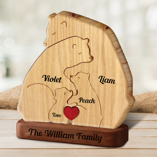 Personalized Single Parent Family With Stand - Puzzle Wooden Bear Family - Wooden Pet Carvings