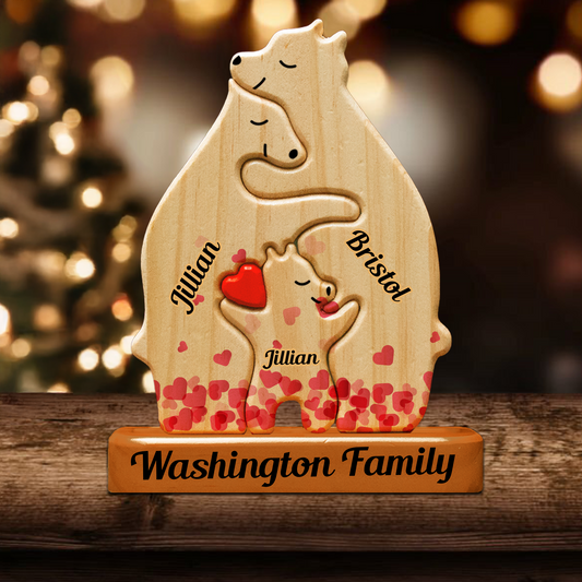 Heart Personalized Wooden Bears Family, Bear Shaped Wood Puzzle with Custom Name- Gift for Valentine's Day, Christmas