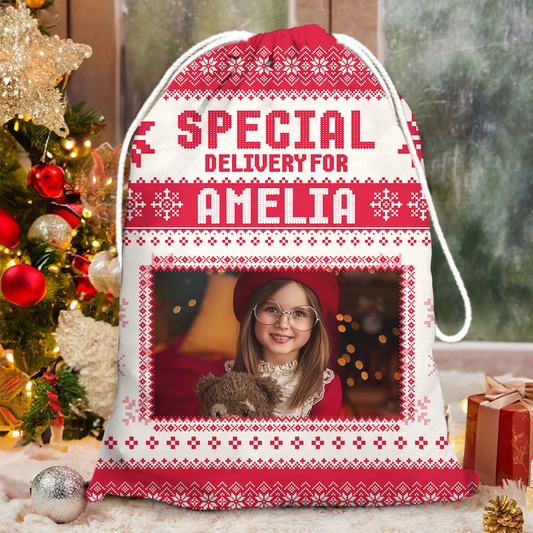 Glitter Special Delivery Christmas Sack - Custom Photo Name Presents Bag - Christmas Gift