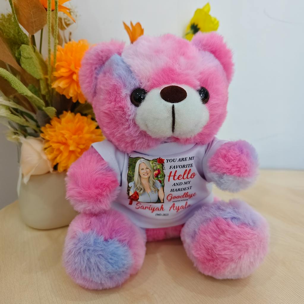 I bought this bear after i'd seen an advert in Facebook I was a bit dubious at first but thought sod it and I'm so pleased I did they have done a fantastic job of the pic I sent the bear is just absolutely beautiful so well made and just what I needed after losing my husband 4 months ago I'm now hugging it all the time thank you so much for such a beautiful hug bear💙💙💙
