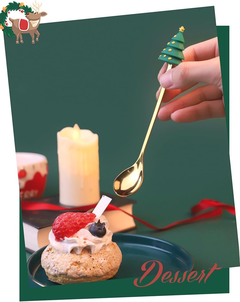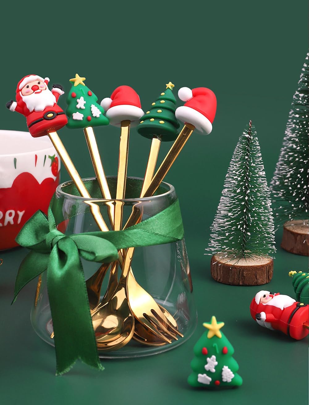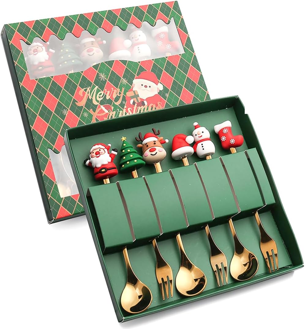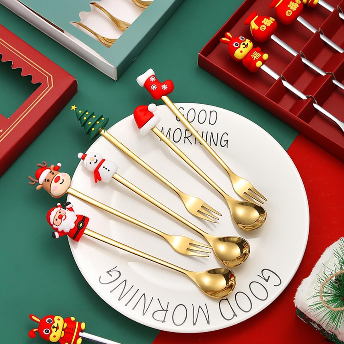 Christmas Cutlery Set, 6 PCS Stainless Steel Spoon and Forks Utensils Set for Coffee Dessert, Ideal Christmas Gift Gold Style
